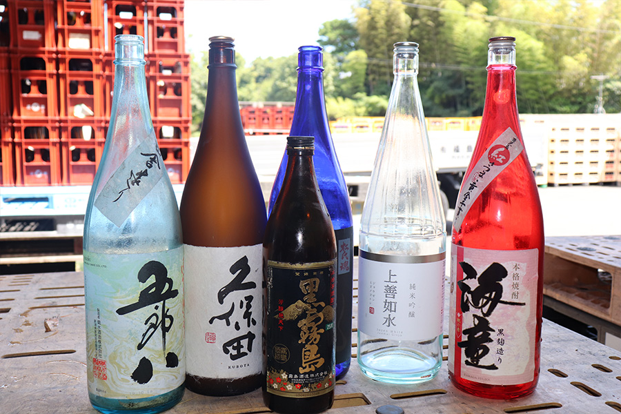 特殊な形をした物や、赤等の一般的な一升瓶には使用されていない色が着色された物、透明でない擦りガラスで作られた物は酒造店が特注で生産している物の為、買取する事ができません。